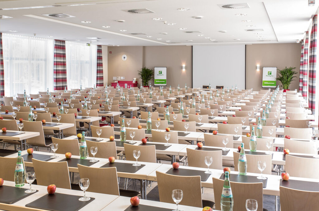 Maximale Bestuhlungsmöglichkeiten Holiday Inn: Bankett: 298 Personen, parlamentarisch: 180 Personen, Stuhlreihen: 240 Personen, U-Form: 82 Personen Euromoda: Bankett: 380 Personen, parlamentarisch: 300 Personen, Stuhlreihen: 500 Personen, U-Form: 90 Personen